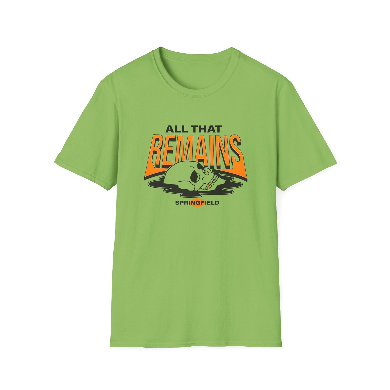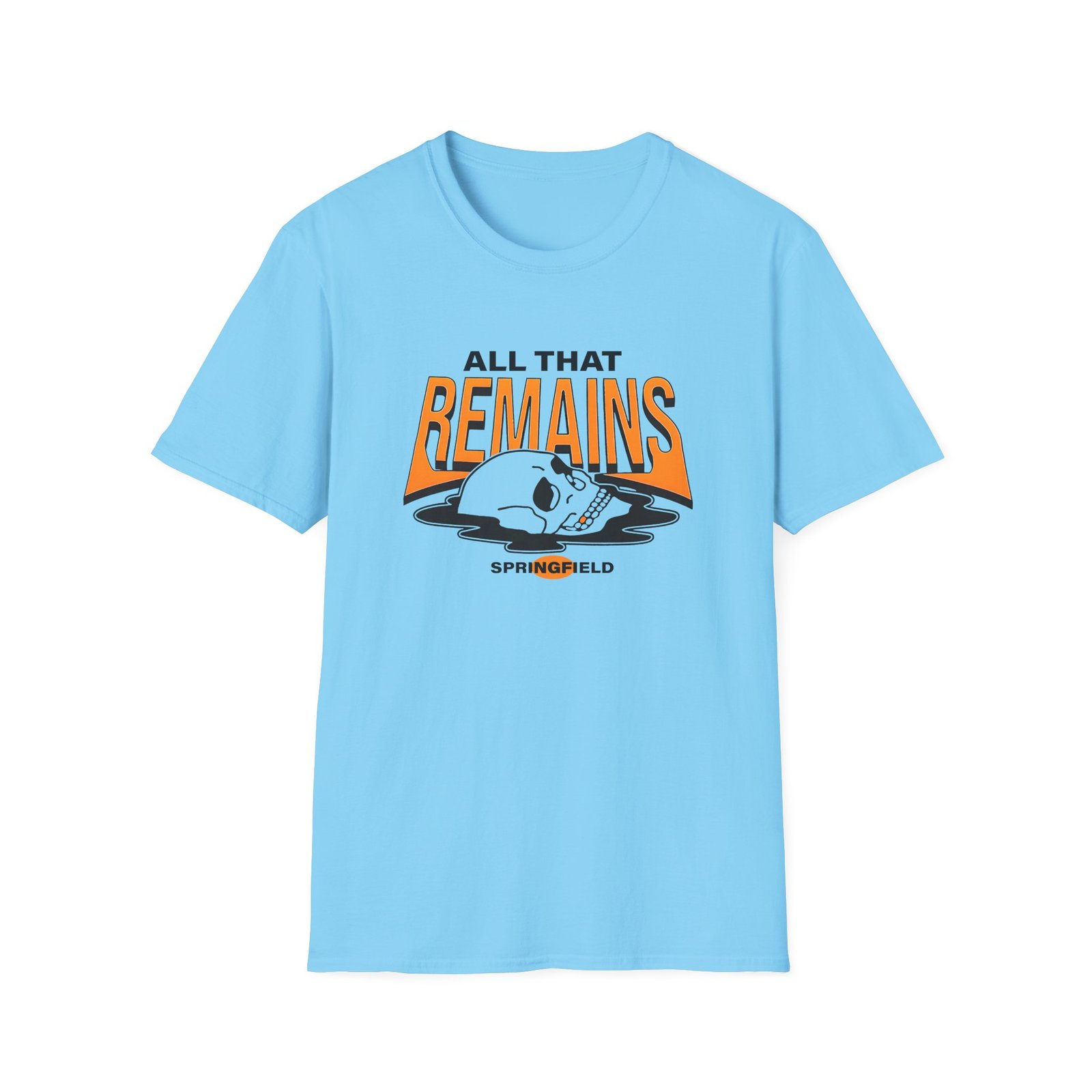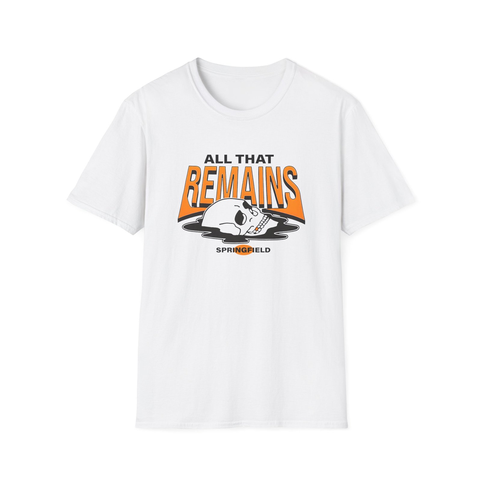The All That Remains Springfield Skull unisex soft-style t-shirt puts a new spin on casual comfort. Made from very soft materials, this tee is 100% cotton for solid colors. Heather colors and sports grey include polyester. The shoulders have twill tape for improved durability. There are no side seams. The collar is made with ribbed knitting to prevent curling damage.