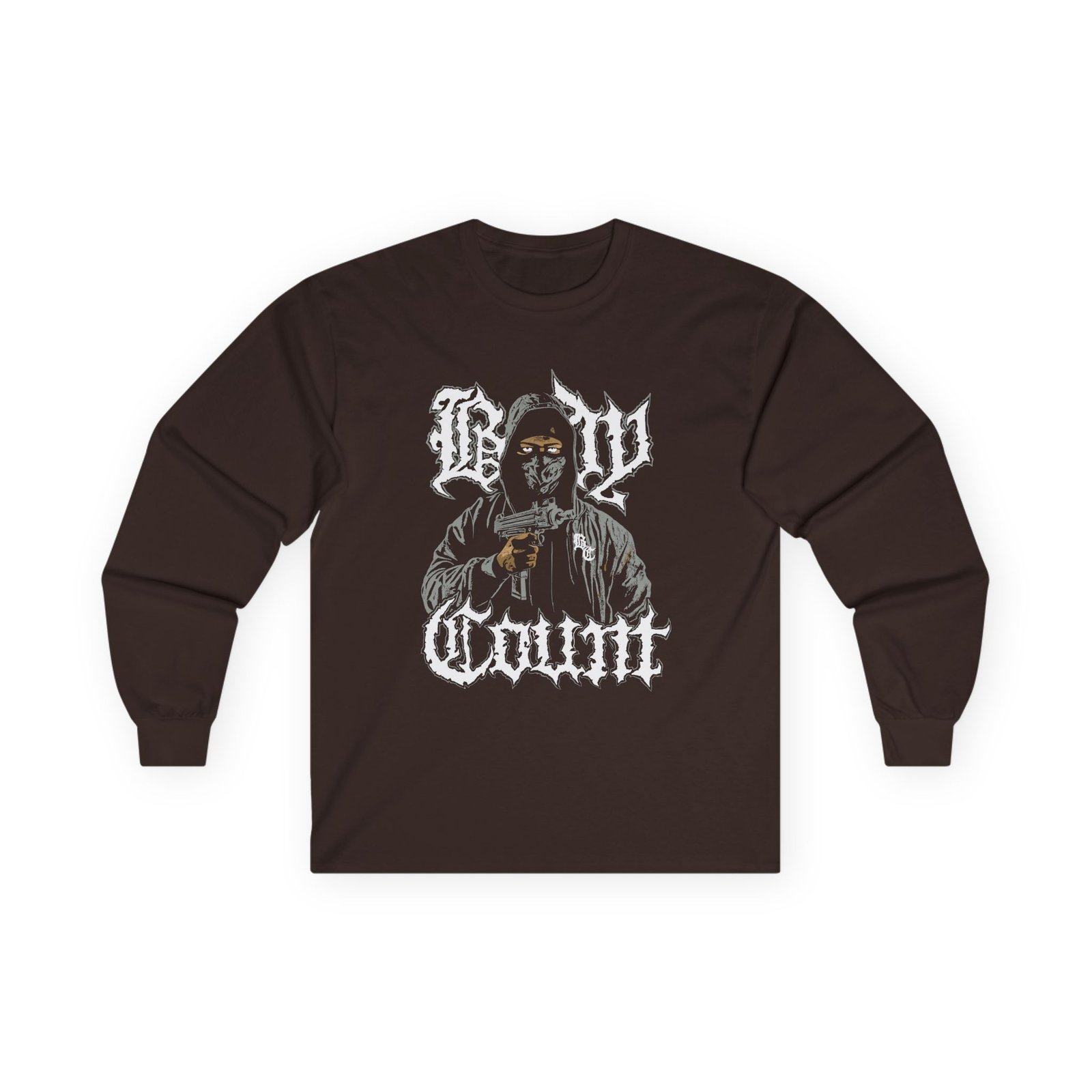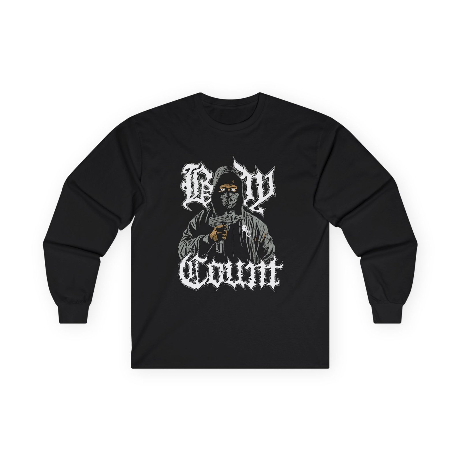 A bit more formal than a standard-issue t-shirt, the Body Count Masked Punk ultra cotton long sleeve tee is a clear comfort winner. The sleeves also act as a nice frame. There are no side seams. The shoulders are taped for improved durability. This makes for a good fitting around the shoulders and neck. The cotton used for these shirts is environmentally friendly.
