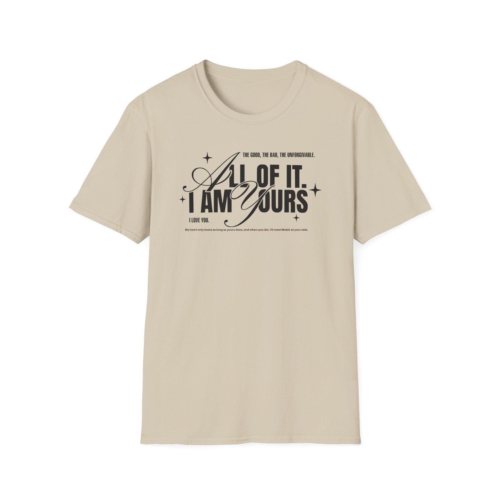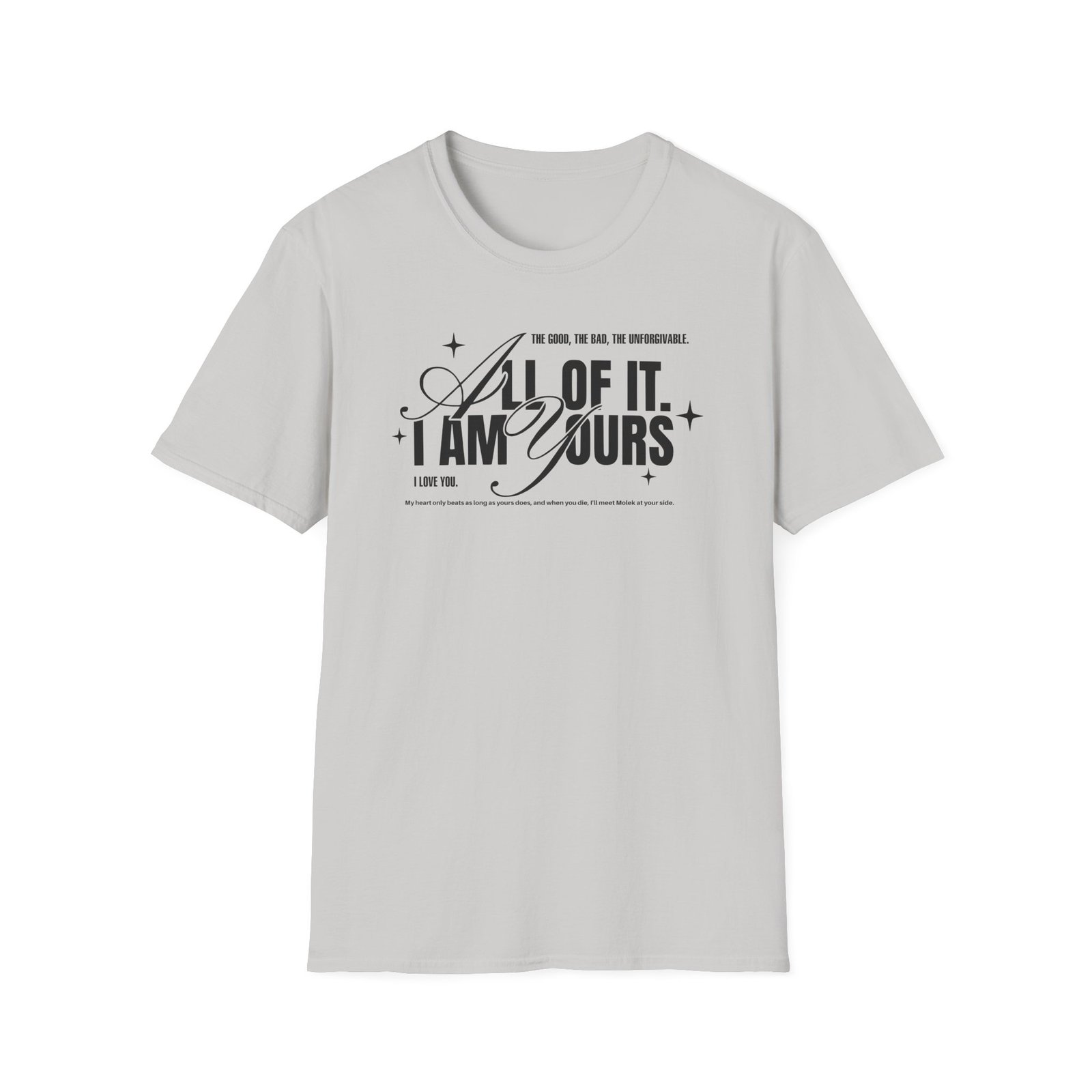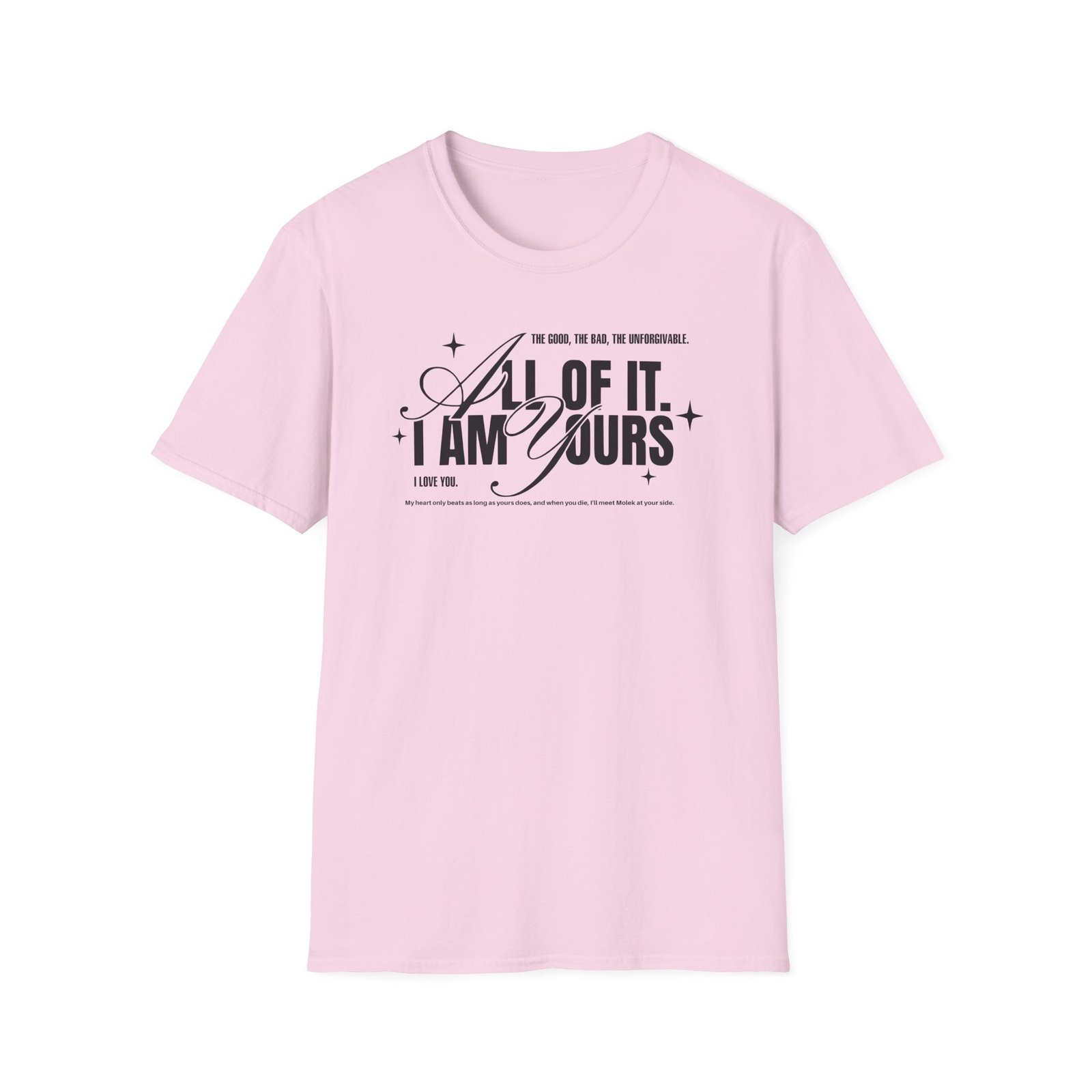The Fourth Wing Iam Yours unisex soft-style t-shirt puts a new spin on casual comfort. Made from very soft materials, this tee is 100% cotton for solid colors. Heather colors and sports grey include polyester. The shoulders have twill tape for improved durability. There are no side seams. The collar is made with ribbed knitting to prevent curling damage.