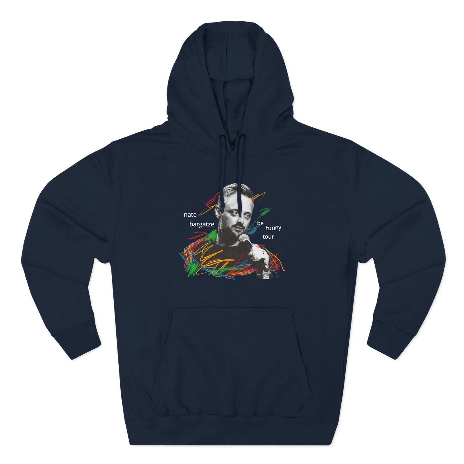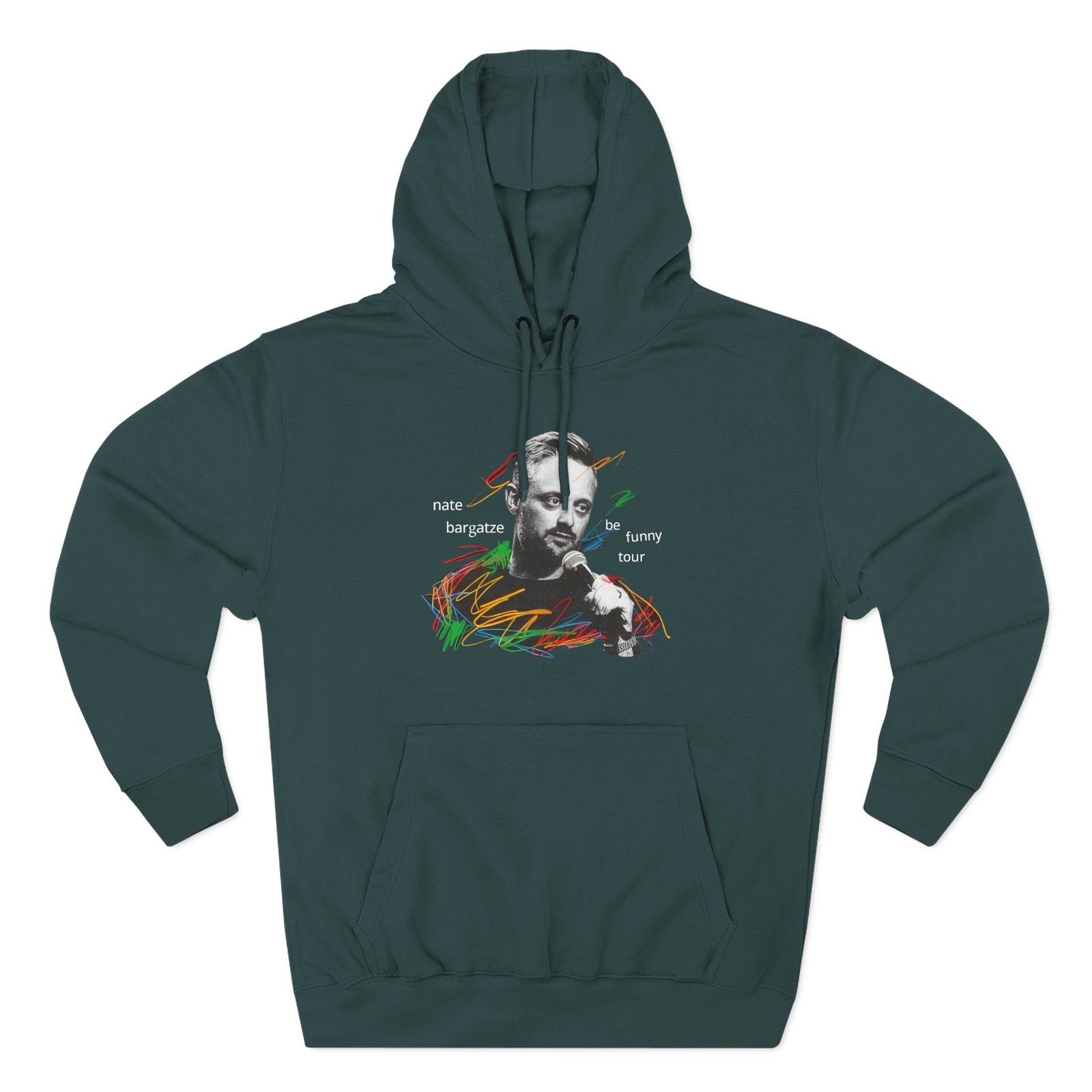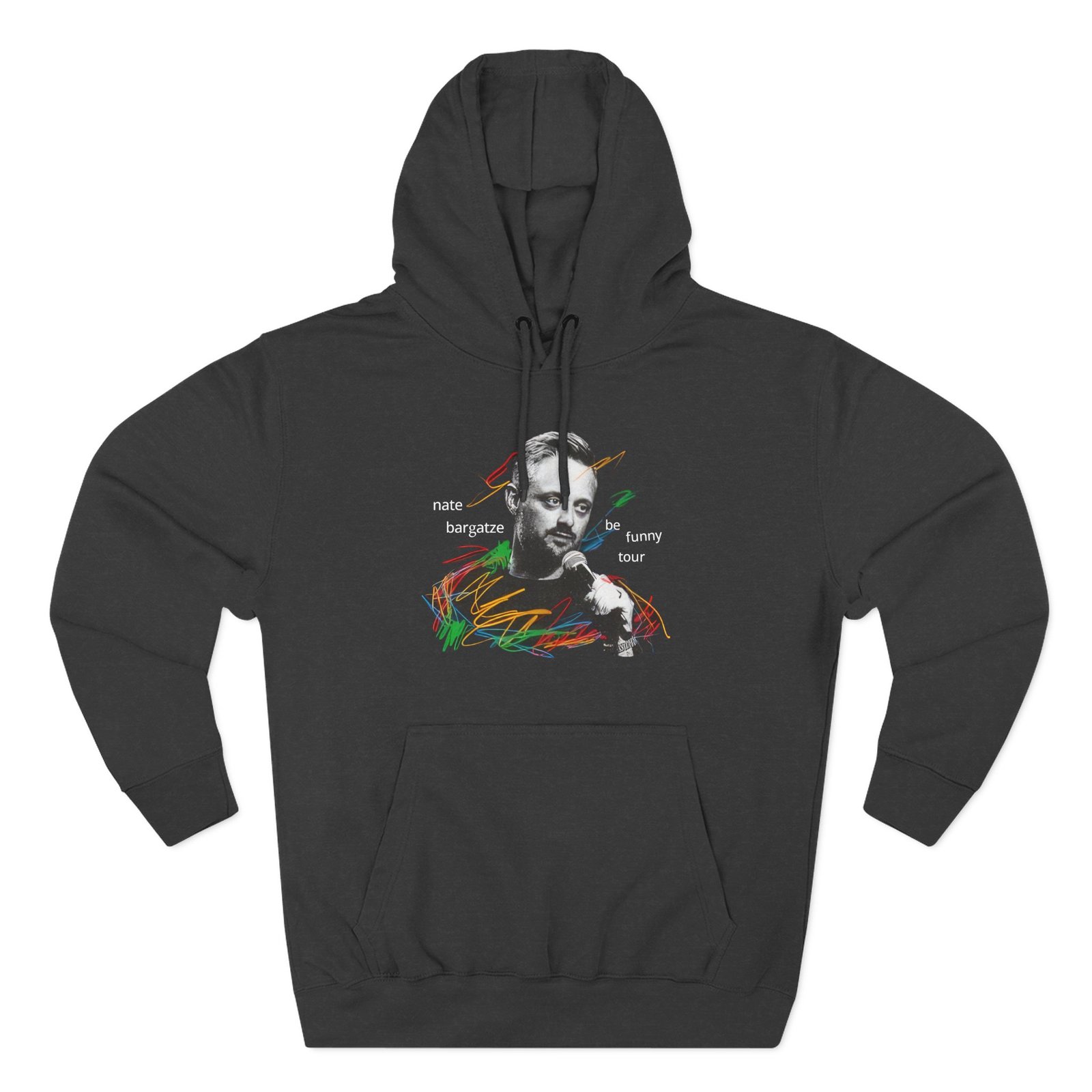Beat the cold with this Nate Bargatze 2024 Be Funny Tour premium pullover hoodie that’s just the right layer of warm and cozy. Made with three-panel fleece lining, this pullover is double stitched for durability and roomy. Pick one in your favorite color to match your style.