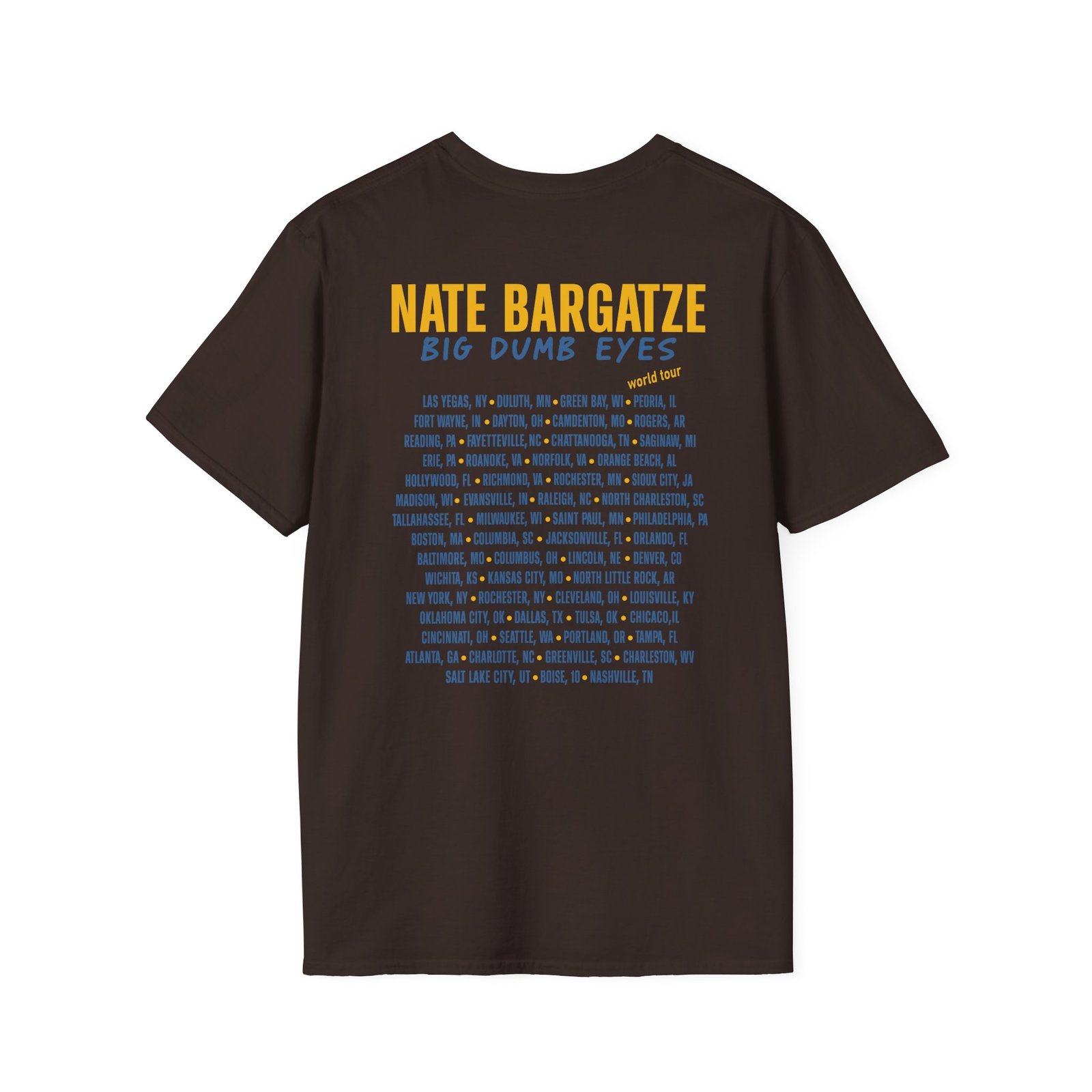 Introducing our stylish Nate Bargatze Big Dumb Eyes Tour unisex softstyle t-shirt, the perfect blend of comfort and personality! This unique shirt adds a playful vibe to your wardrobe, making it an ideal choice for casual outings, hangouts with friends, or cozy nights in. The lightweight fabric makes it feel like a second skin, perfect for year-round wear. Whether you’re attending a comedy show, celebrating a birthday, or just want to showcase your fun side, this tee is the ideal addition to your ensemble. It’s suitable for anyone who loves to express their individuality through fashion, whether you’re a fan of humor or simply appreciate quality craftsmanship. Great for birthdays, holiday gatherings, or just as a treat for yourself!