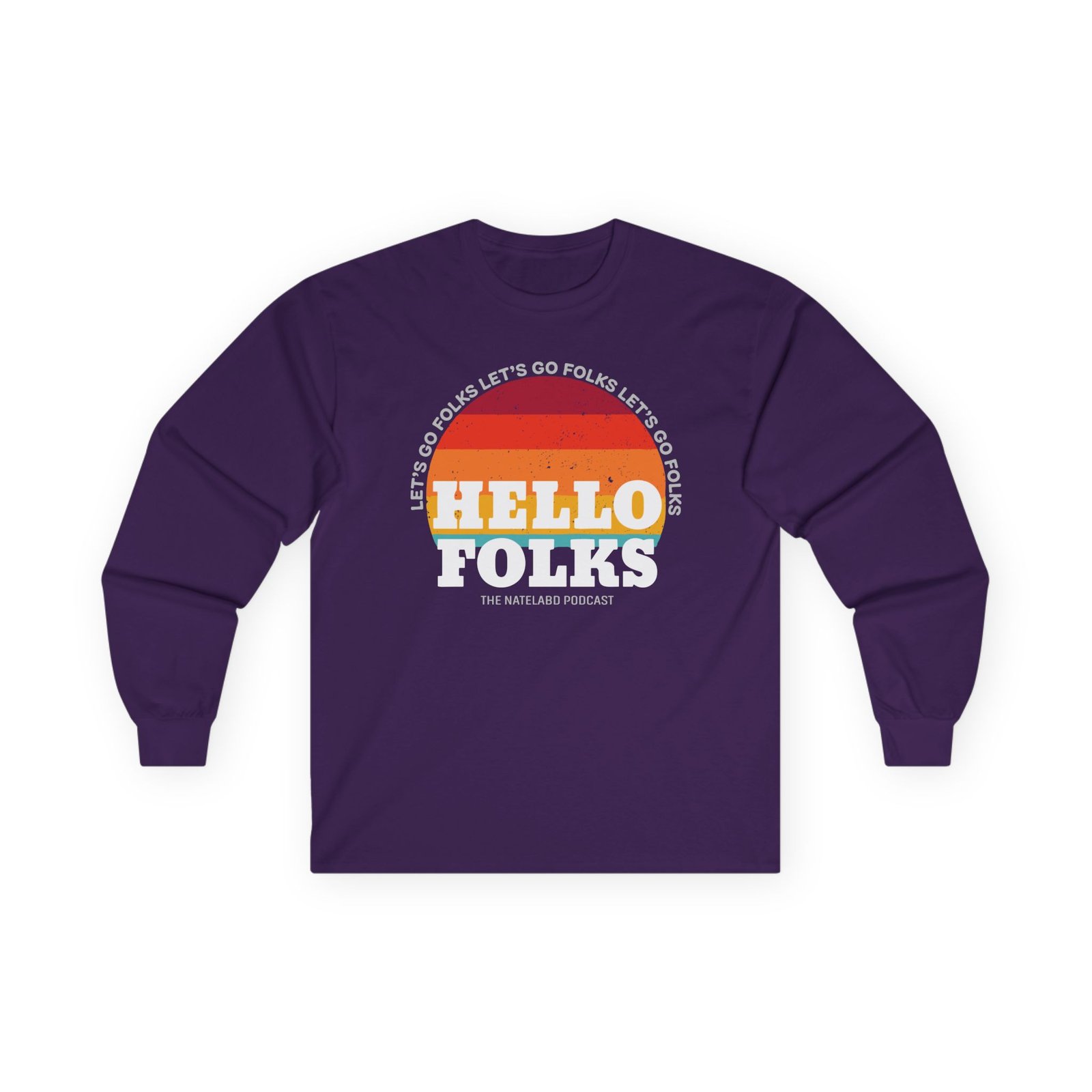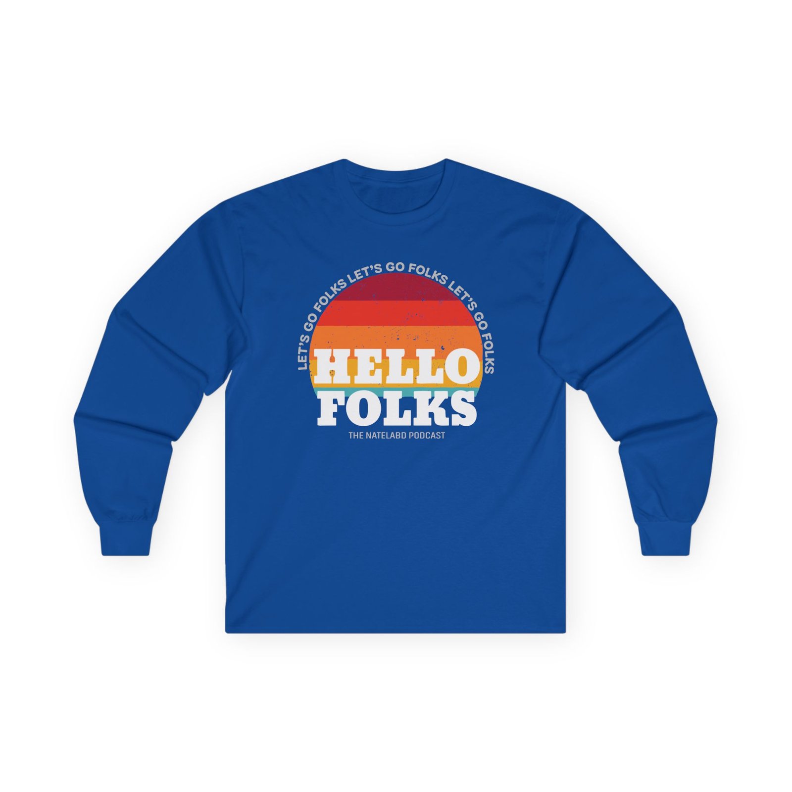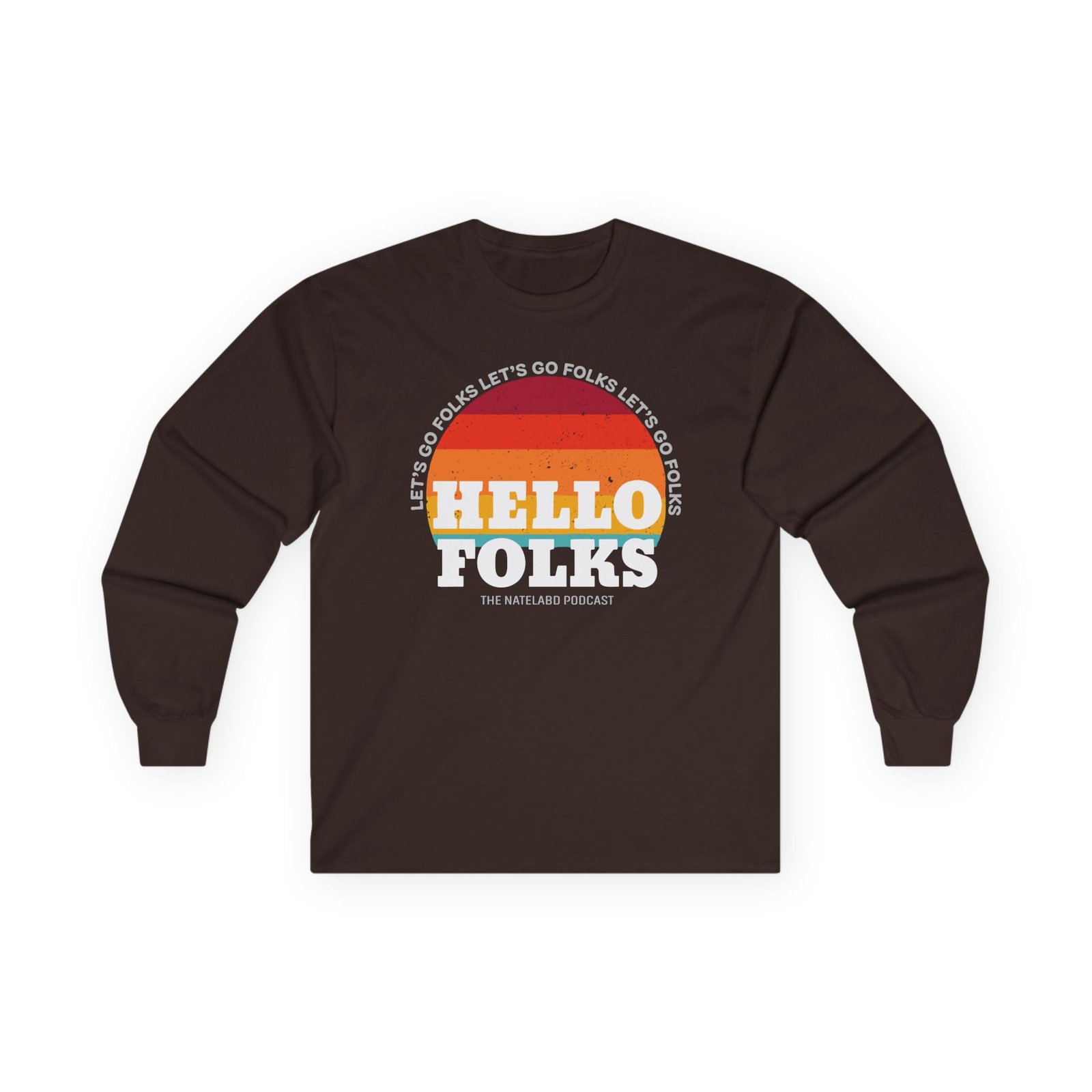 A bit more formal than a standard-issue t-shirt, the Nate Bargatze Hello Folks ultra cotton long sleeve tee is a clear comfort winner. The sleeves also act as a nice frame. There are no side seams. The shoulders are taped for improved durability. This makes for a good fitting around the shoulders and neck. The cotton used for these shirts is environmentally friendly.