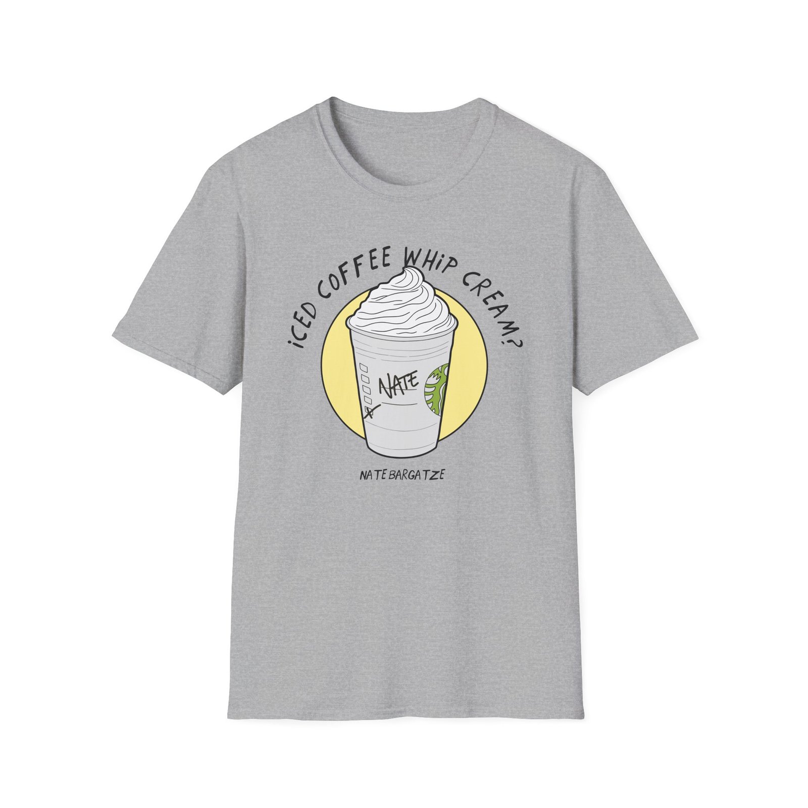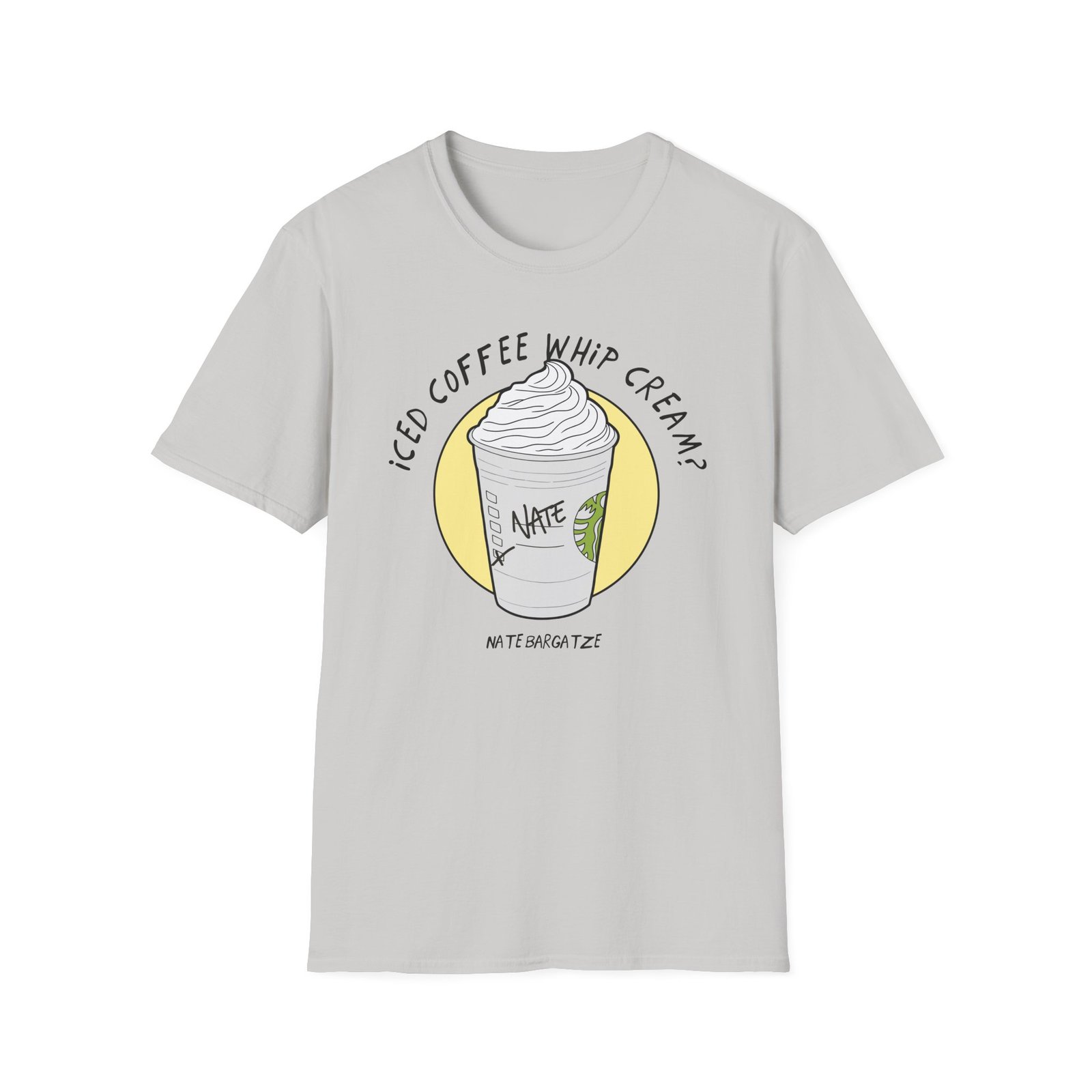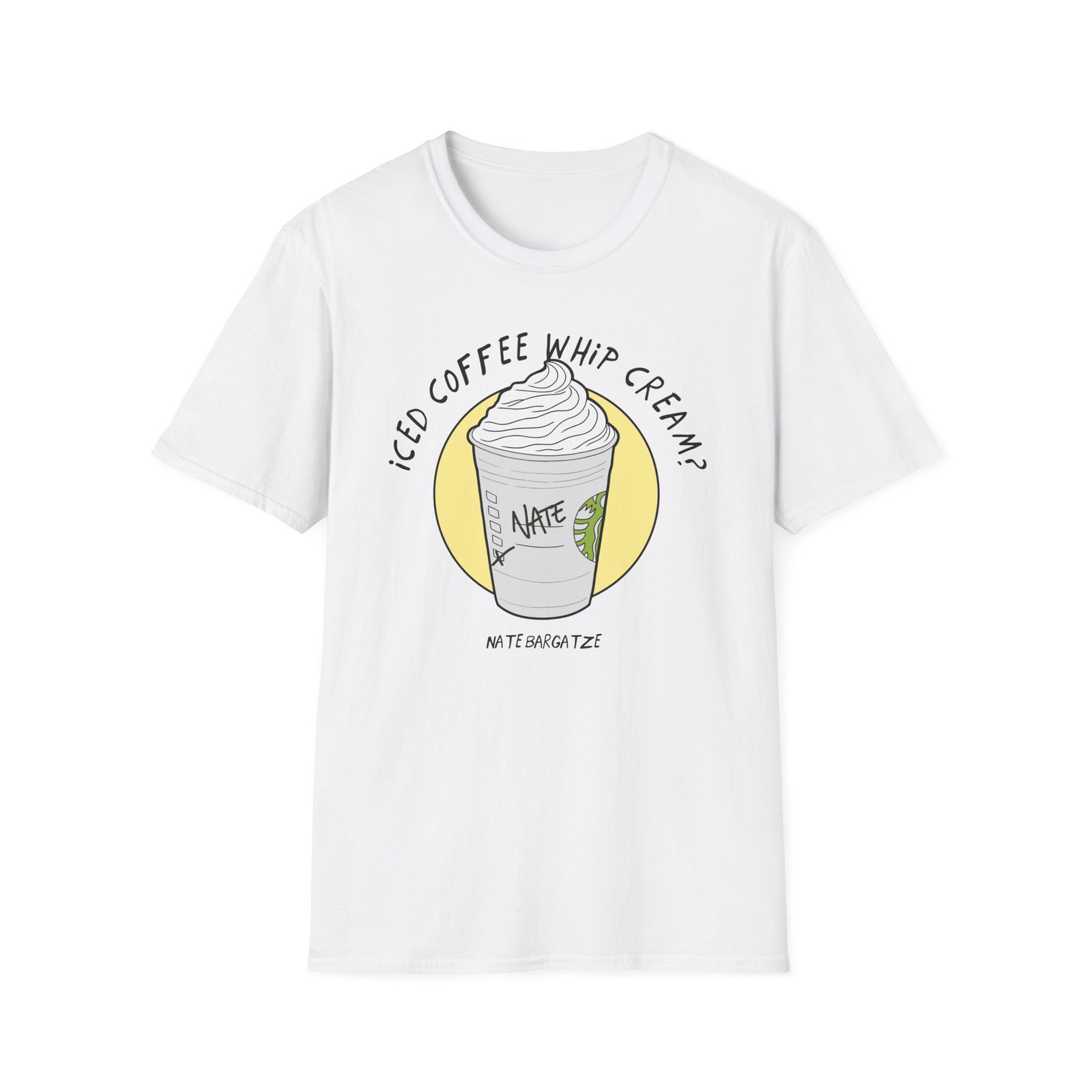 The Nate Bargatze – Iced Coffee Whip Cream? unisex soft-style t-shirt puts a new spin on casual comfort. Made from very soft materials, this tee is 100% cotton for solid colors. Heather colors and sports grey include polyester. The shoulders have twill tape for improved durability. There are no side seams. The collar is made with ribbed knitting to prevent curling damage.
