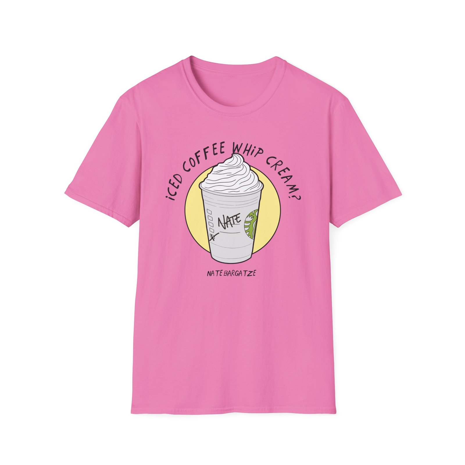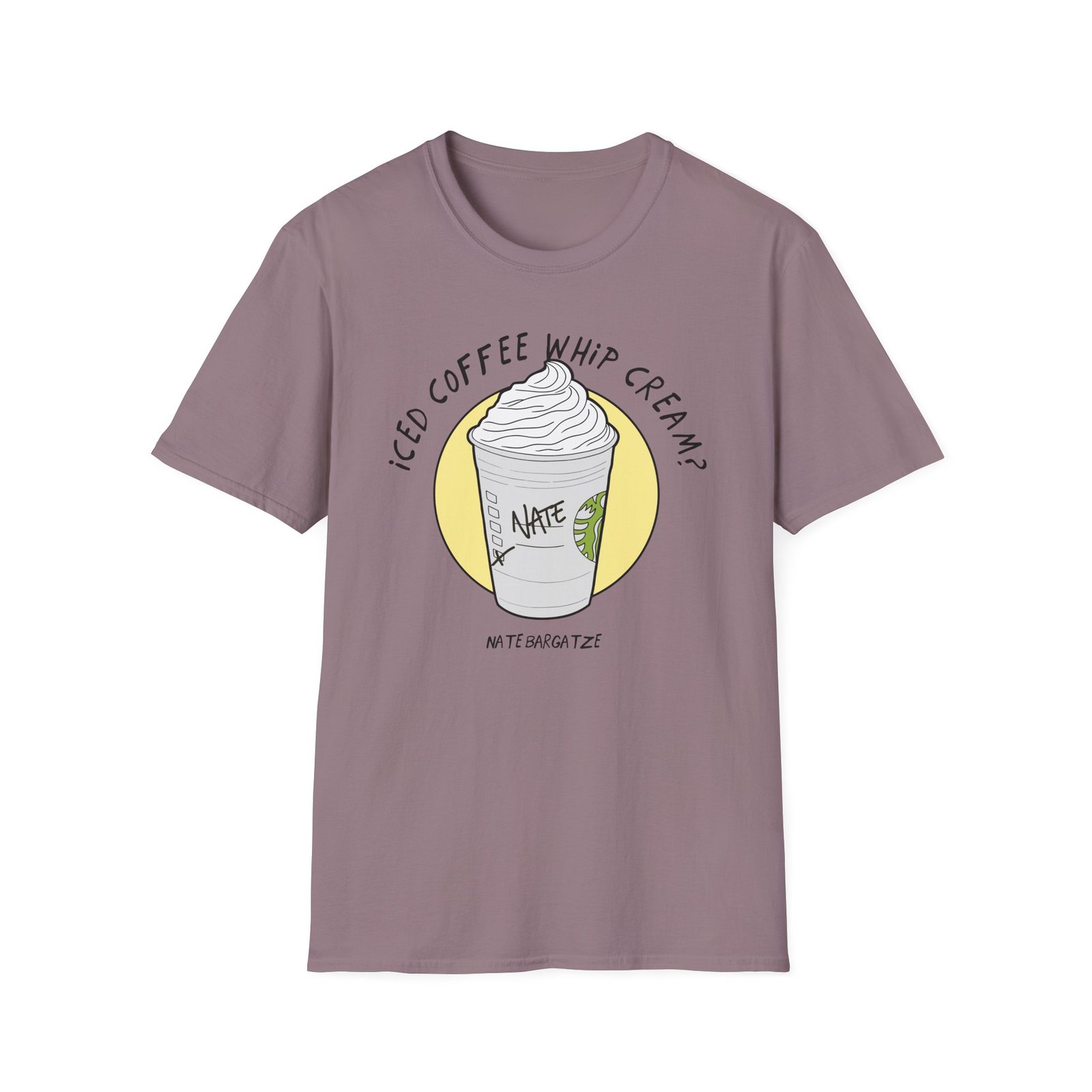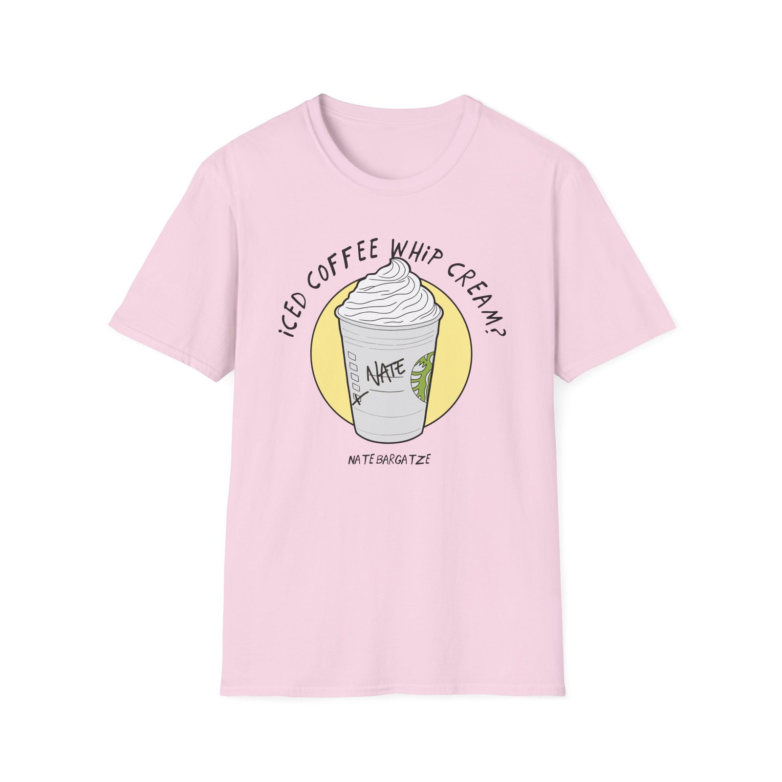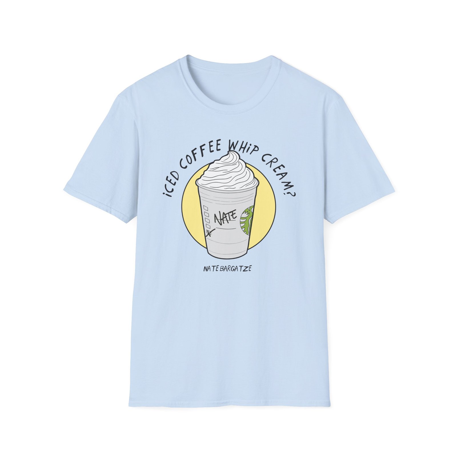 The Nate Bargatze – Iced Coffee Whip Cream? unisex soft-style t-shirt puts a new spin on casual comfort. Made from very soft materials, this tee is 100% cotton for solid colors. Heather colors and sports grey include polyester. The shoulders have twill tape for improved durability. There are no side seams. The collar is made with ribbed knitting to prevent curling damage.