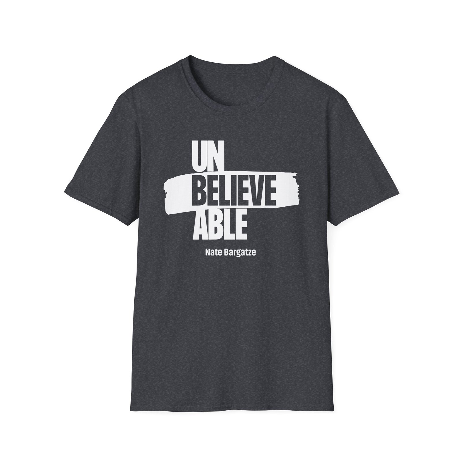 The Nate Bargatze – Unbelievable unisex soft-style t-shirt puts a new spin on casual comfort. Made from very soft materials, this tee is 100% cotton for solid colors. Heather colors and sports grey include polyester. The shoulders have twill tape for improved durability. There are no side seams. The collar is made with ribbed knitting to prevent curling damage.
