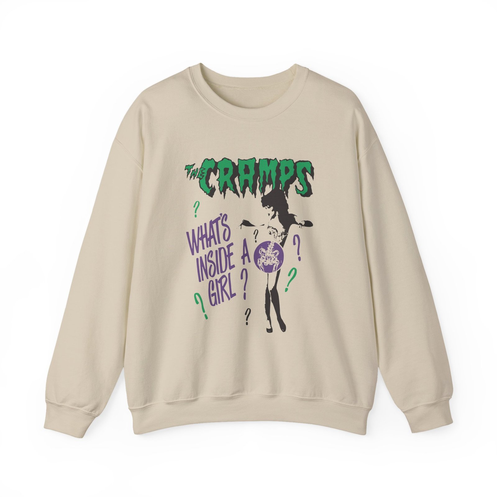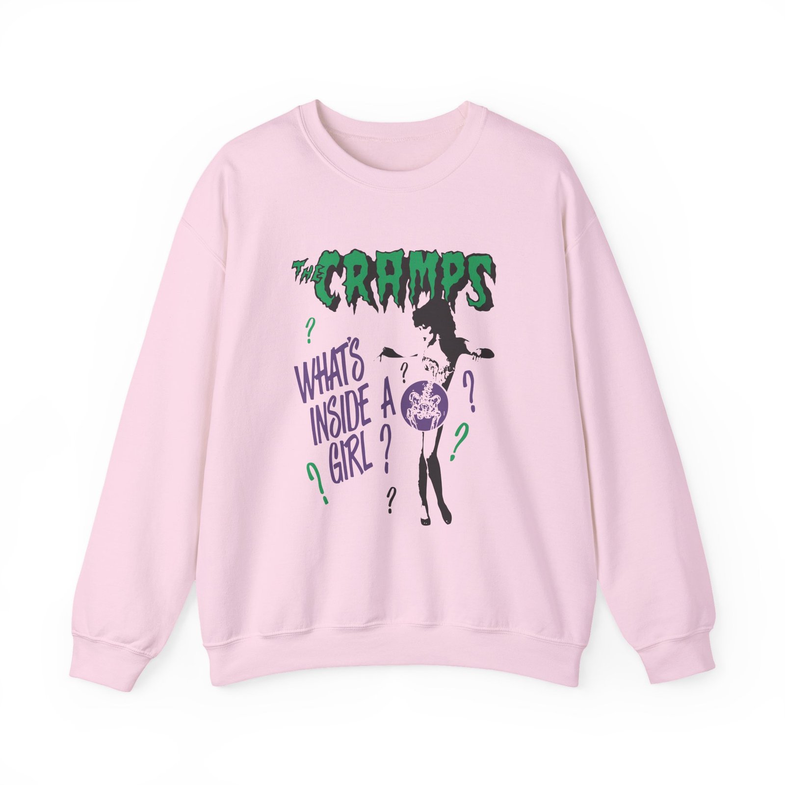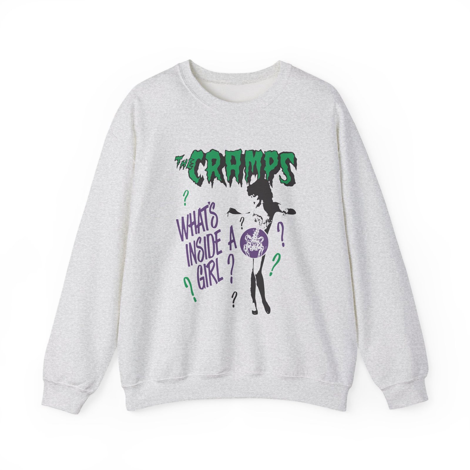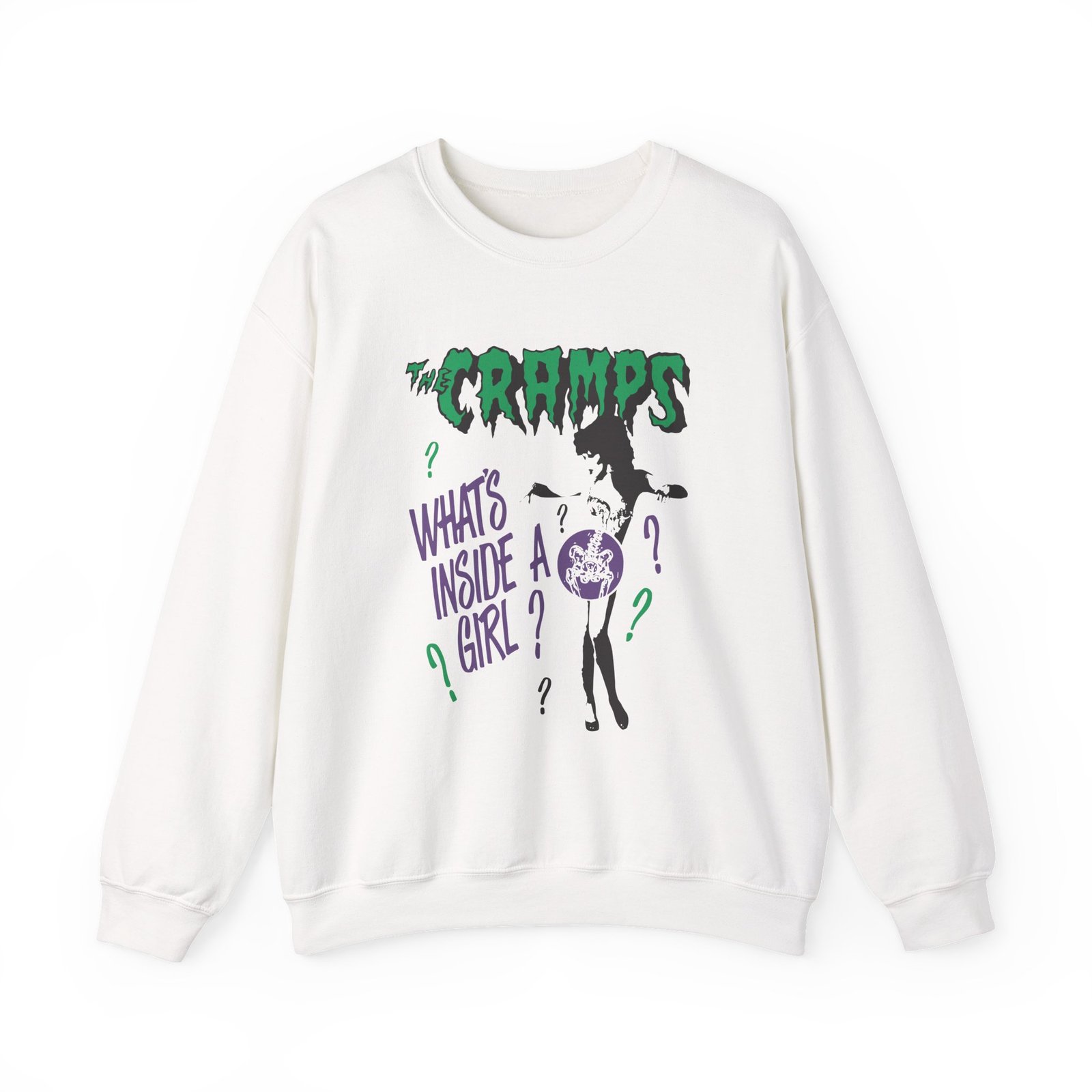 Ideal for any situation, a The Cramps What’s Inside a Girl unisex heavy blend crewneck sweatshirt is pure comfort. These garments are made from polyester and cotton. This combination helps designs come out looking fresh and beautiful. The collar is ribbed knit, so it retains its shape even after washing. There are no itchy side seams on these sweaters.