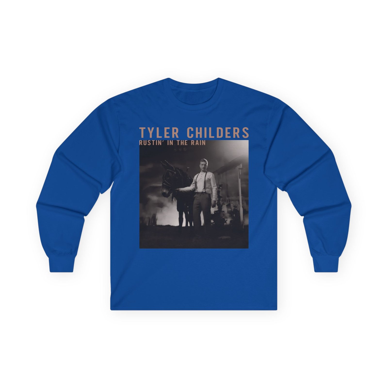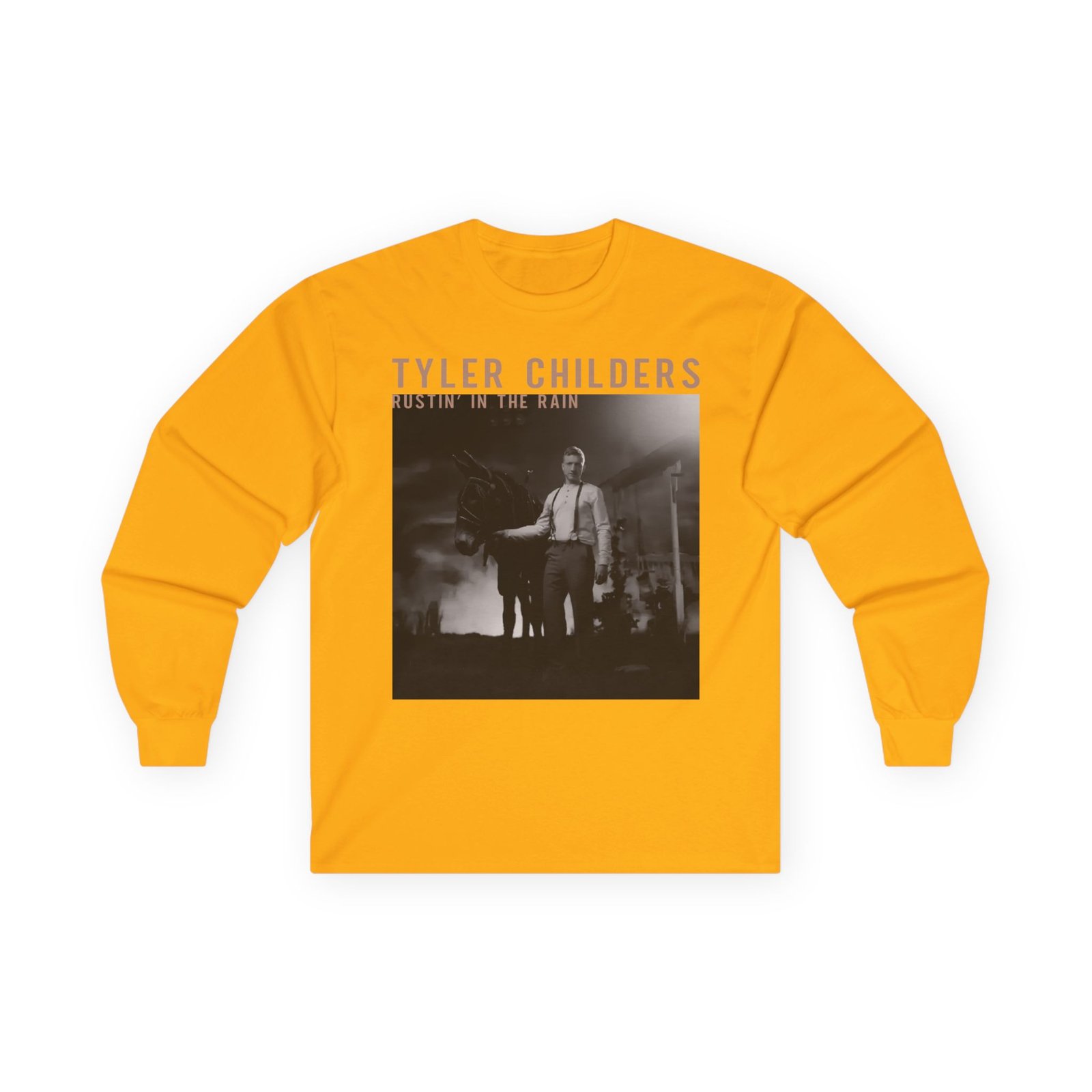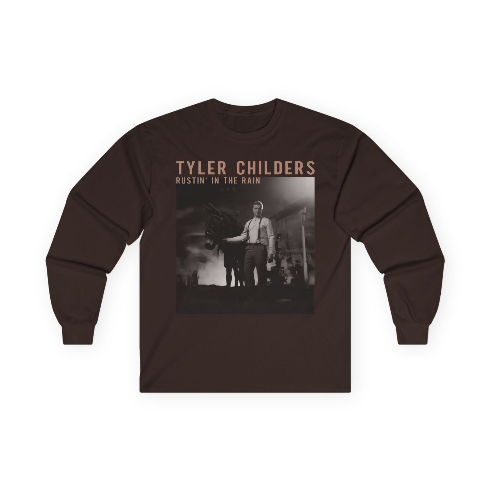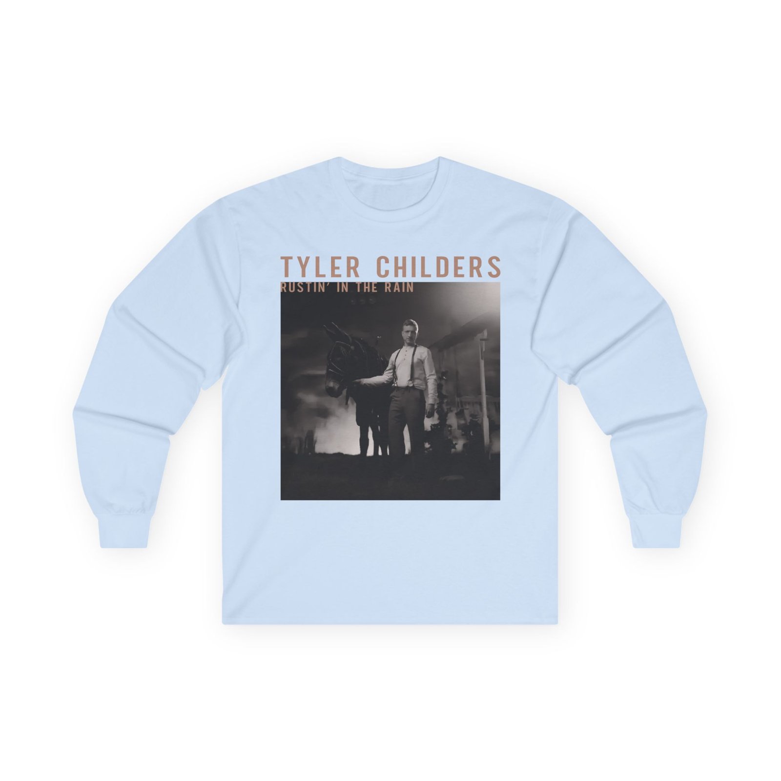 A bit more formal than a standard-issue t-shirt, the Tyler Childers Black Rustin ultra cotton long sleeve tee is a clear comfort winner. The sleeves also act as a nice frame. There are no side seams. The shoulders are taped for improved durability. This makes for a good fitting around the shoulders and neck. The cotton used for these shirts is environmentally friendly.